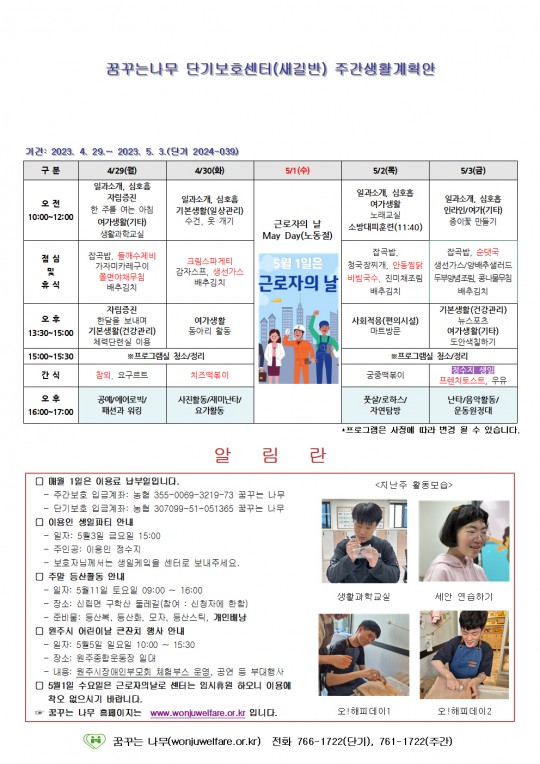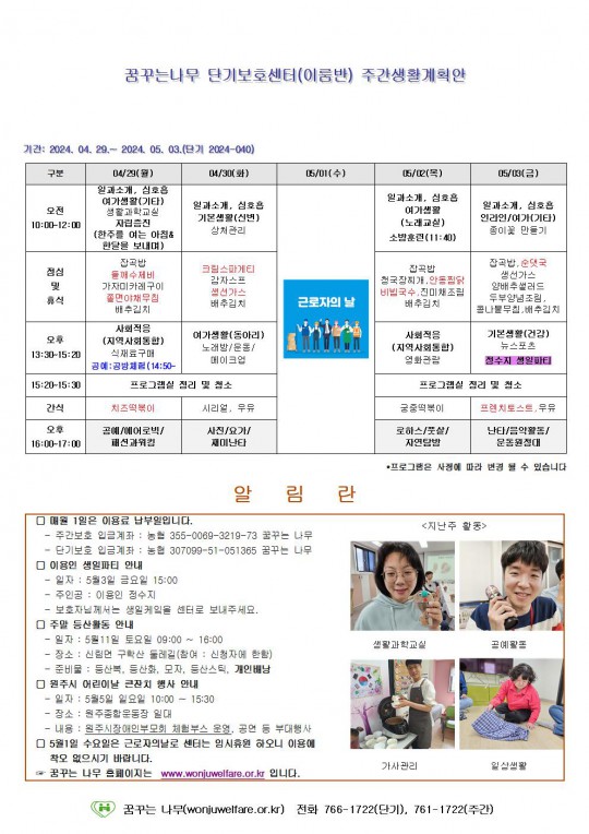 2024.04.29 ~ 2024.05.03 단기보호 주간계획안입니다.