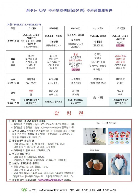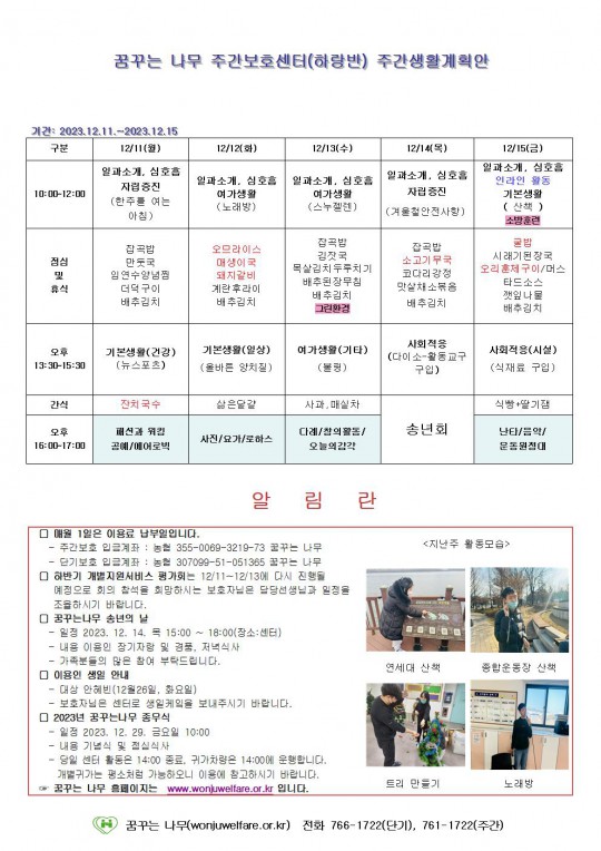 주간계획안(하랑/윤슬/찬솔/라온)2023.12.11~