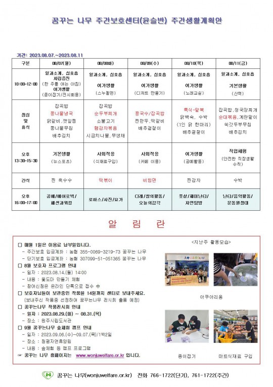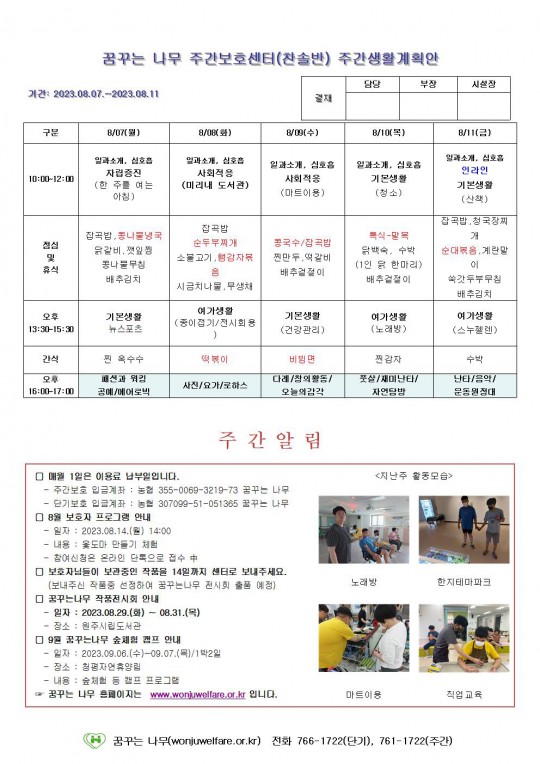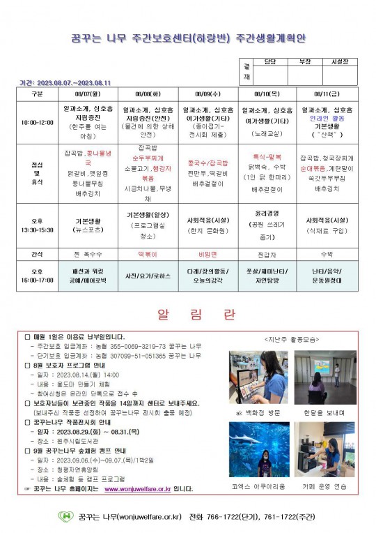 주간계획안(하랑/윤슬/찬솔/라온) 2023.08.07~
