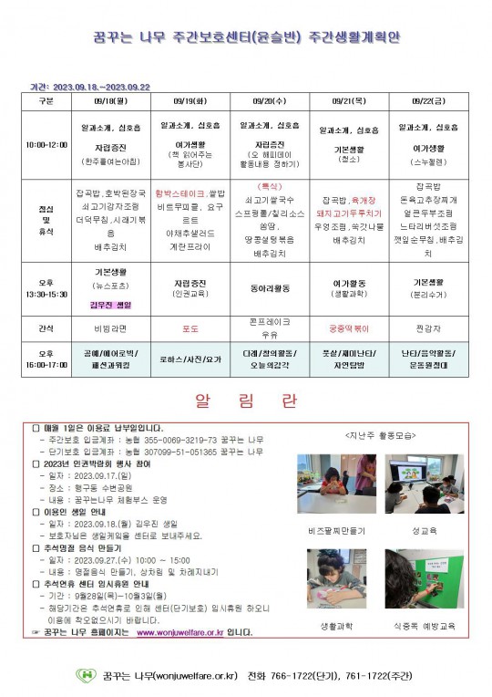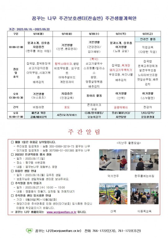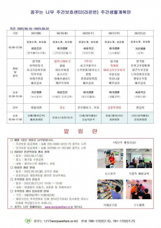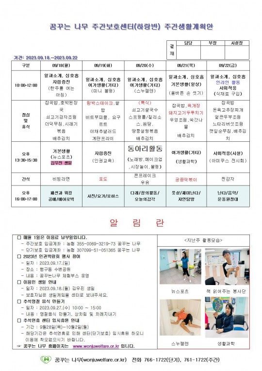 주간계획안(하랑/윤슬/찬솔/라온) 2023.09.18~