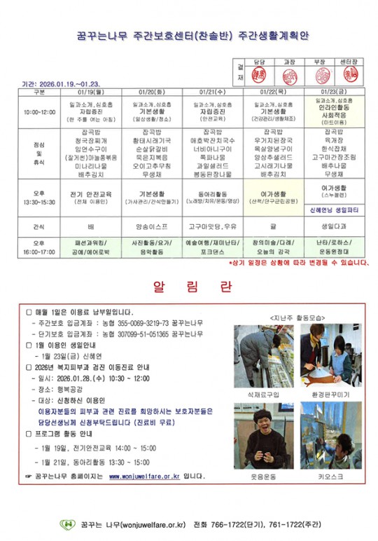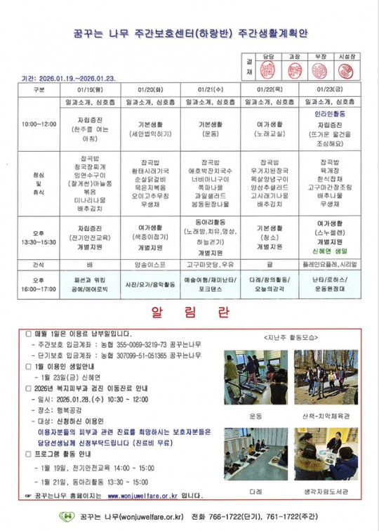 찬솔반, 라온반, 윤슬반, 하랑반 주간계획안(2026.01.19~2026.01.23)