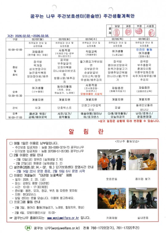 찬솔반, 라온반, 윤슬반, 하랑반 주간계획안(2026.02.02~02.06)