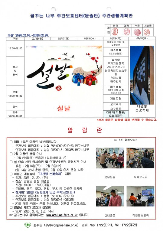 찬솔, 라온, 하랑, 윤슬 주간계획안(2026.02.16~2026.02.20)