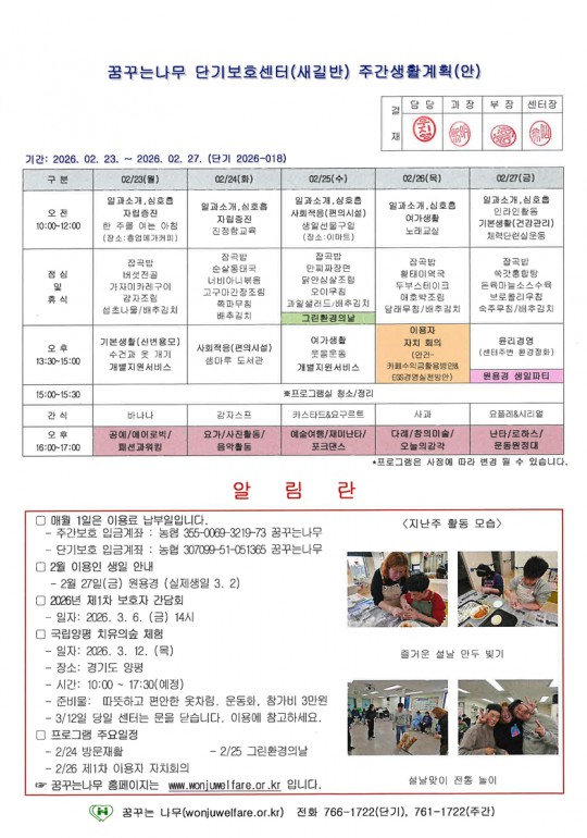 이룸반, 새길반 주간계획안(2026.02.23~02.27)