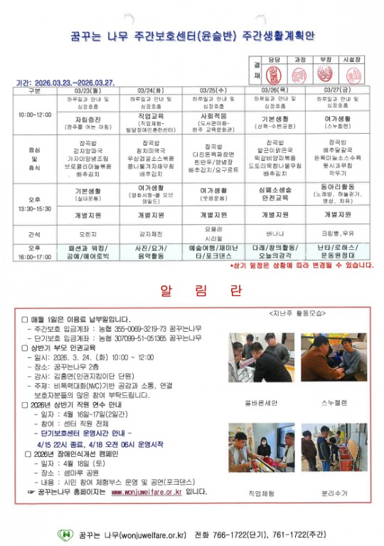 찬솔반, 하랑반, 윤슬반, 라온반 주간계획안(2026.03.23~03.27)