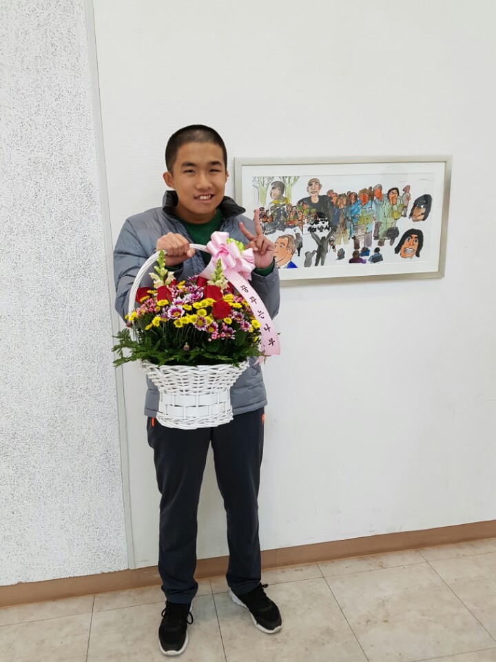희망점프 전 이라고 하여 원주교육문학관 1층에도 영진씨의 그림뿐만 아니라 장애를 가진 여러 학생들의 작품이 전시되어 있었습니다. 수능날로 청원학교 친구들도 학교에 가지 않아 다함께 영진씨의 그림을 보러 다녀왔습니다. 자신의 그림 앞에 가 한참을 바라보는 영진씨와 그런 영진씨에게 아낌없는 칭찬을 해 준 동료 친구들^^ "우와  멋있다." "진짜 잘그린다" 라며 엄지 손가락 치켜 세우고 어찌나 칭찬을 해주는지......친구들과 영진씨 모두 어깨가 으쓱했던 하루였습니다.