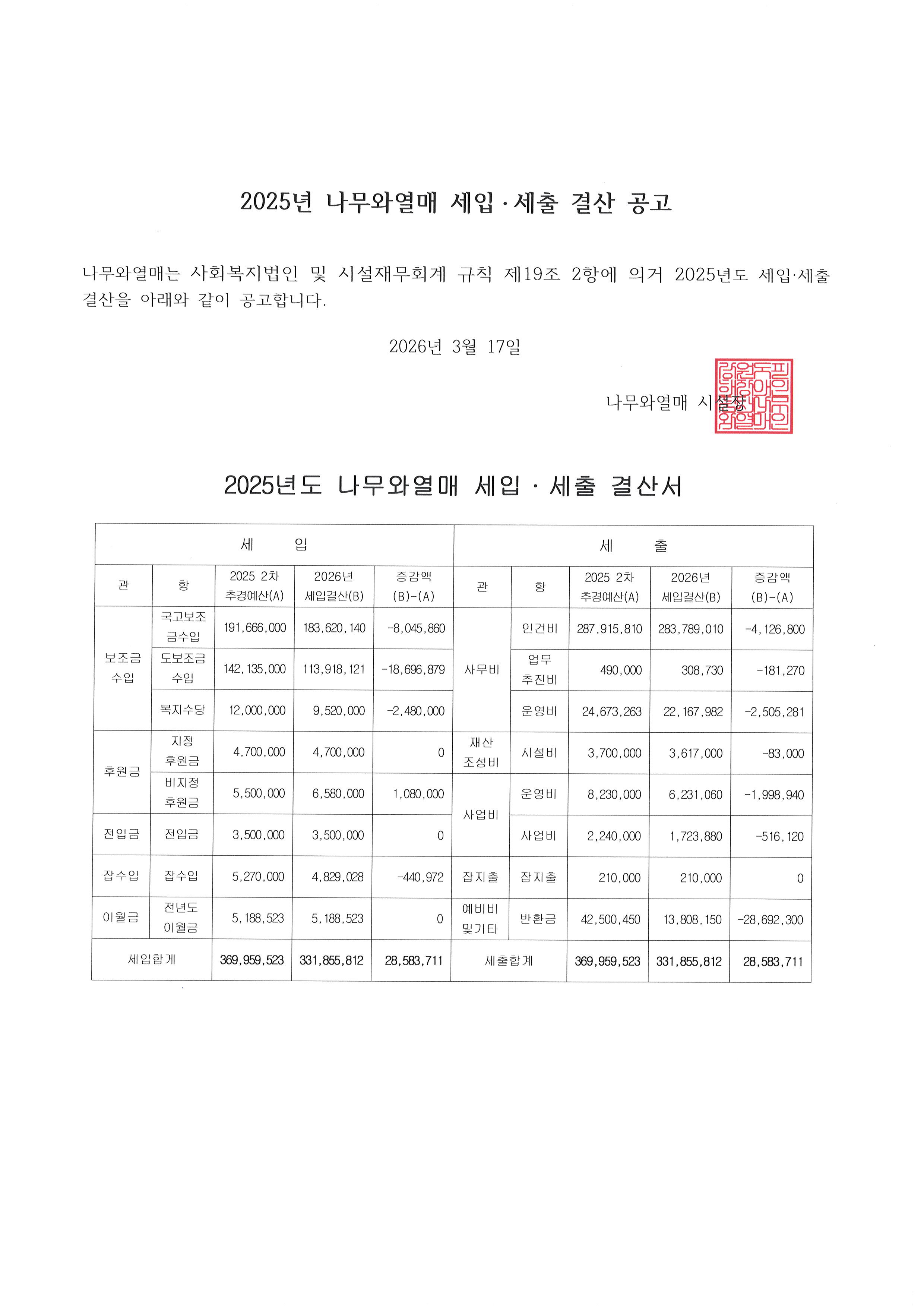 나무와열매 2025년 결산공고