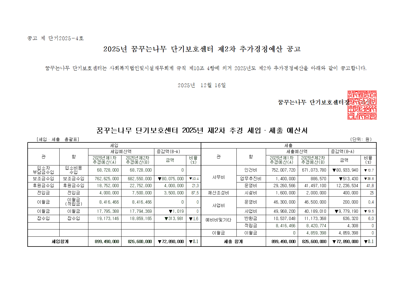 꿈꾸는나무 단기보호센터 2025년 제2차 추가경정예산 공고