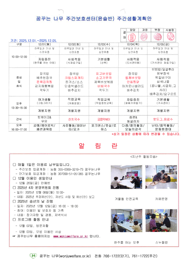 찬솔, 윤슬, 하랑, 라온 주간계획안입니다(2025.12.01~2025.12.05)