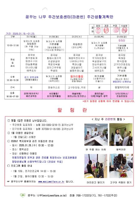 찬솔반, 라온반, 윤슬반, 하랑반 주간계획안(2026.01.19~2026.01.23)