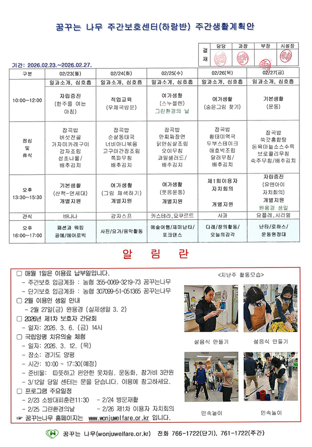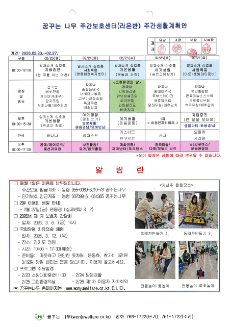 라온반, 윤슬반, 하랑반, 찬솔반 주간계획안(2026.02.23~02.27)