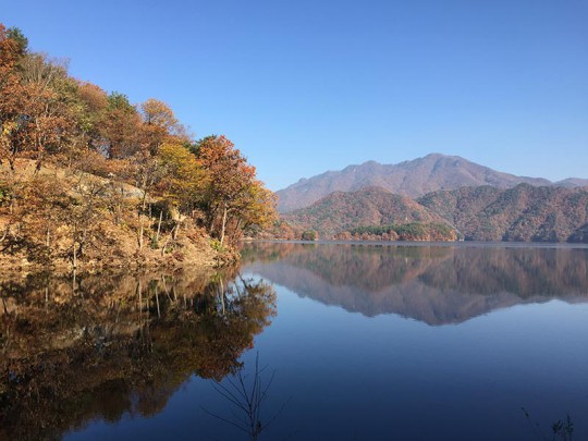호수에 비치는 능선의 모습이 그림처럼 느껴집니다.