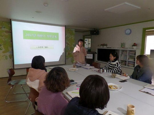 2017년 하반기 직원연수가 11월 17일 ,18일 이틀에 걸쳐 진행되었습니다. 인권감수성 틔우기에 대한 강의를 이찬미 강사님께서 진행해 주셨으며, 도전적 행동에 대한 강의를 이은진 과장님께서 진행해 주셨답니다. 감사드립니다. 직원연수를 통해 나 자신을 되돌아보기도 하고, 직원 상호간 화합을 다지는 좋은 기회였습니다. 충전된 에너지로 이용인분들께 보다 질좋은 서비스를 제공하겠습니다..