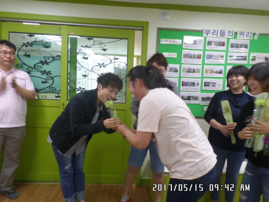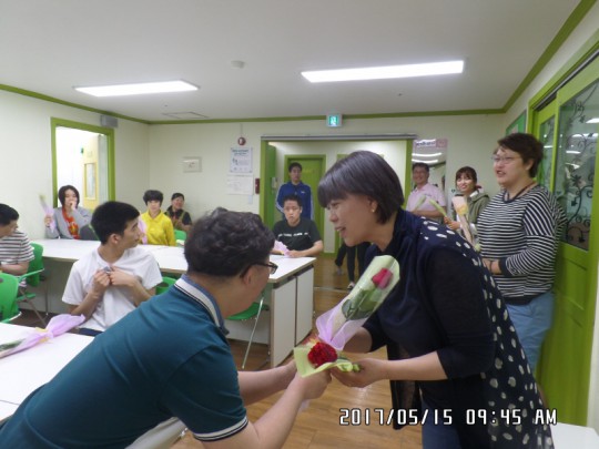 만 백성을 까막눈에서 해방시킨 우리 민족의 스승이신 세종대왕의 탄신일을 기념으로 제정된 스승의 날.. 꿈꾸는 나무에서도 스승의 날 행사가 진행되었습니다. 이용인 김한울양이 센터 전 직원들에게, 감사의 표시로 카네이션 꽃다발을 전달해 주셨고, 원장님께서도 저희 직원들과 사회복무요원, 자활선생님께 아름다운 장미꽃다발을 선사해 주셨답니다. 감사합니다~ 묻고 , 의논하고, 부탁하며, 함께하는, 저희가 되기 위해 노력하겠습니다..