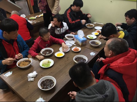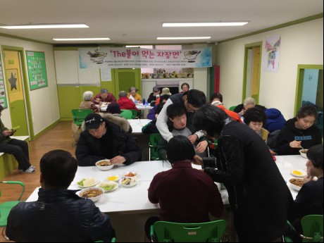맛있게 드시고 집으로 돌아가는 어르신들, 지역주민 여러분, 보호작업장에서