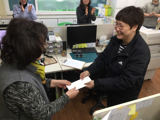 센터에서 마련한 작은 축하금을 전달하며 전체 직원들과 축하하는 자리를 가졌어요.
