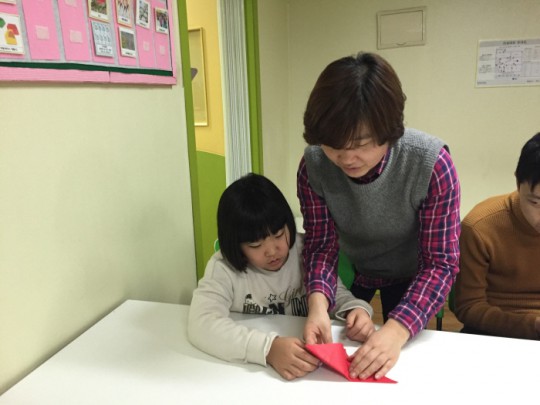 선생님의 시범을 따라하며 열심히 색종이를 접고 또 접고