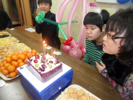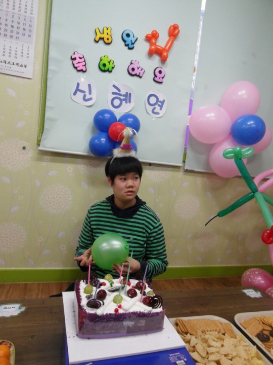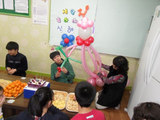 몸이 아파서 한동안 못 봤던 혜연이가 월요일에 왔어요~ 언니들이 얼마나 걱정을 했는지 두손을 잡고 반기고 울기도 했답니다. 미뤄진 생일파티도 했고. 혜연이가 젤루 좋아하는 풍선으로 만든 인형입니다. ^^ 만들 땐 엄청 만지고 싶어하더니 완성된 것을 보곤...영..^^ 그래도 재밌고 맛있는 과자 많아 행복한 생일이었습니다.~★