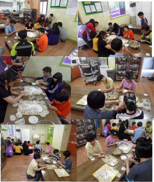 우리 토요일에 맛있는 만두 만들었어요 여러가지 채소와 김치를 넣고 조물락 조물락 여린 손으로 열심히 만들어 먹었지요 재밌는 이야기 꽃을 피우고 땀을 뻘뻘 흘리며 열심히 만들었답니다.
