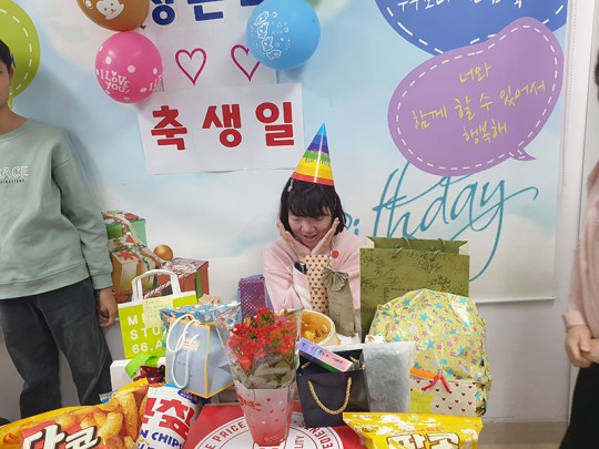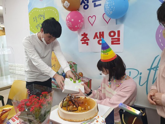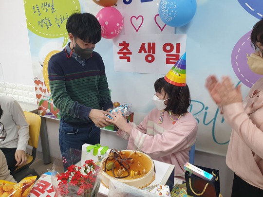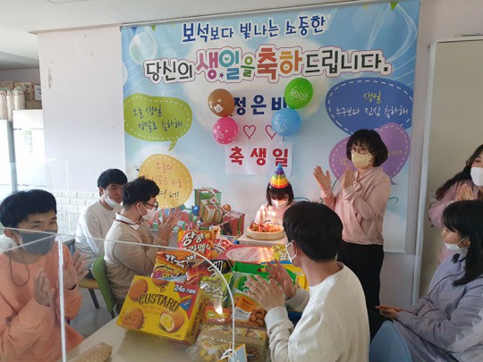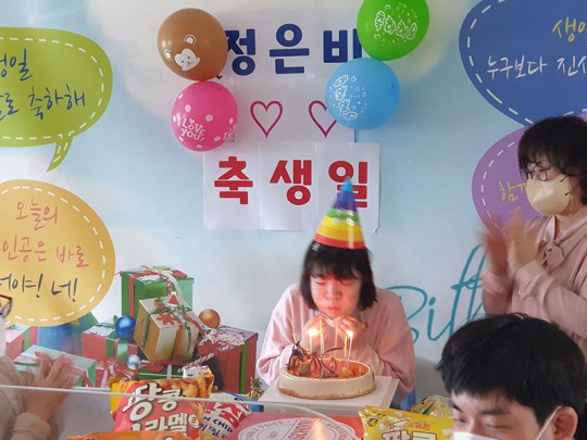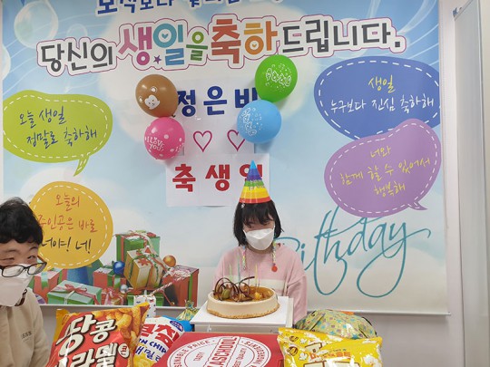 4월 7일 생일을 맞이한 정은비 이용인의 생일파티가 있었습니다. 생일을 맞은 은비씨를 향해서 모두 축하인사와 노래를 불러주고 선물 증정식을 진행하였는데 주인공인 은비씨는 행복하면서도 부끄러운 듯 얼굴을 자꾸 숙이는 모습이었어요. 이후 가정에서 보내주신 케잌과 피자를 나누어 먹으며 즐거운 생일파티가 되었습니다. 감사합니다. 다시한번 은비씨의 생일을 축하하며, 오늘만큼은 누구보다 행복한 하루였기를 바랍니다.