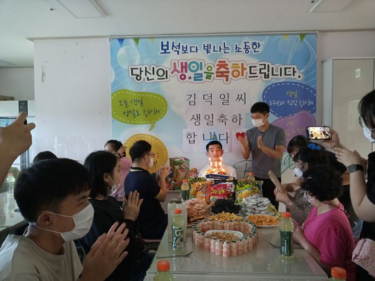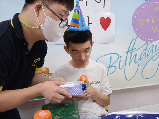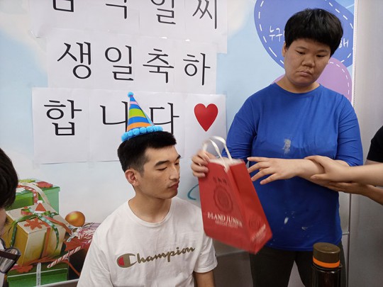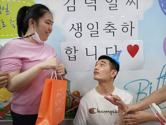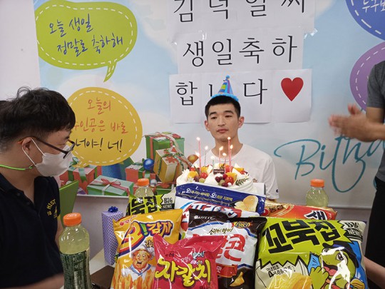 김덕일씨의 26번째 생일파티가 진행되었습니다. 고깔모자를 단정히 쓴 덕일씨.. 동료 이용인분들이 덕일씨의 생일을 축하하며 생일축하노래를 불러주고 생일선물을 전달합니다. 덕일씨~ 생일 축하드려요~ 앞으로도 더욱 건강하고 멋있는 덕일씨가 되시길 바랍니다~