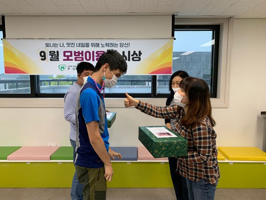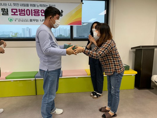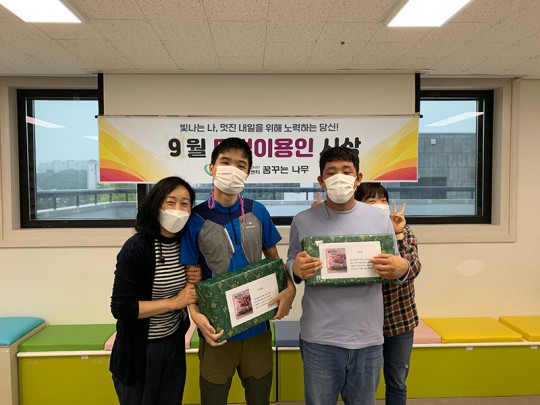 2021년 9월 모범이용인 시상식이 진행되었습니다. 단기는 최경환씨, 주간은 김지섭씨가 수상하셨습니다. 최경환씨는 노래도 잘 부르고 춤도 잘추는 흥이 아주 많고, 배려심이 많아 동료들과 좋은 관계를 유지하고 있습니다. 김지섭씨는 신중하고 점차 표현력 증가와 예절을 잘지키려는 모습을 보여주고 있습니다. 9월 모범이용인으로 선정되신 최경환씨, 김지섭씨 다시한번 축하드립니다.