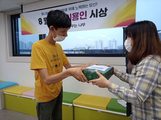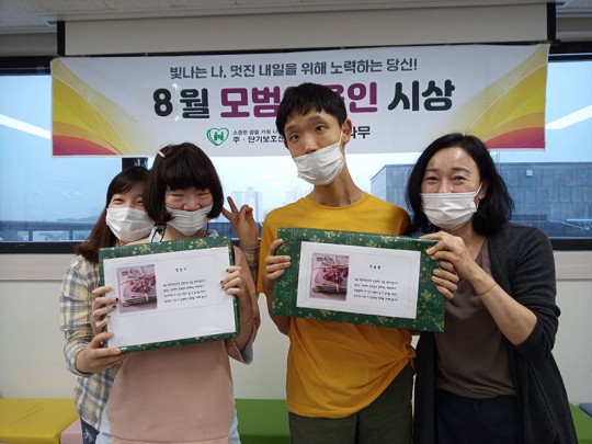2021년 8월 모범이용인 시상식이 진행되었습니다. 단기는 정은비씨, 주간은 조용환씨가 수상하셨습니다. 정은비씨는 바른 자세를 유지하기 위해 무던히 노력하고 있습니다. 센터에서 가장 씩씩하고 상냥하게 인사하는 은비씨입니다. 조용환씨는 노래를 부르는 모습이 멋집니다. 환하게 미소지으며 활동 참여도 잘 하시는 용환씨가 되시길 기대해 봅니다. 8월 모범이용인으로 선정되신 정은비씨, 조용환씨 다시한번 축하드립니다.