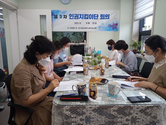 2021년 3차 인권지킴이단 회의가 2021년 9월 10일 꿈꾸는나무에서 진행되었습니다. 2분기 인권지킴이단 활동보고와 9월인권상황점검을 진행해 주셨습니다. 이용자분들의 인권옹호를 위해 관심가져 주시고 애써 주시는 인권지킴이단 단장님 및 외부단원님들께 진심으로 감사드립니다.