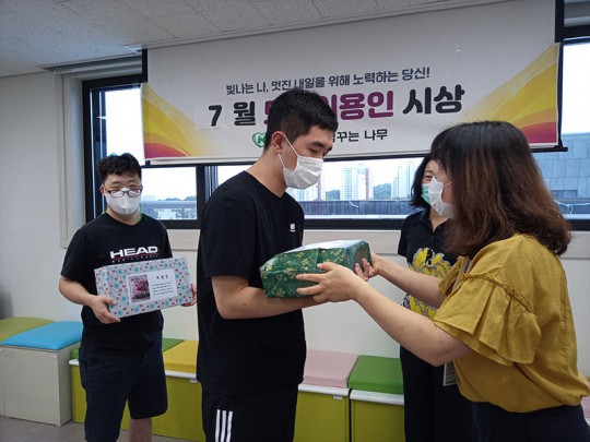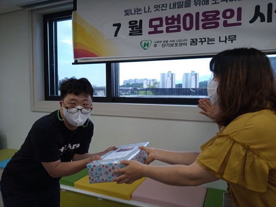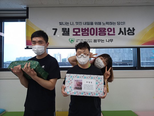 2021년 7월 모범이용인 시상식이 진행되었습니다. 단기 이용인은 함형석씨 주간 이용인은 조영빈씨가 수상하셨습니다. 형석씨는 센터에서의 생활도 잘 하시지만 활동보조선생님과 연계한 외부활동으로 긍정적 변화를 보이고 계십니다. 영빈씨는 스스로 건강관리를 잘 하시며 동료이용인분들께도 항상 친절하신데요.. 여러분의 노력이 헛되지 않도록, 여러분이 주인되는 삶을 위해, 꿈꾸는나무는 응원하겠습니다. 형석씨~영빈씨~ 축하드립니다~