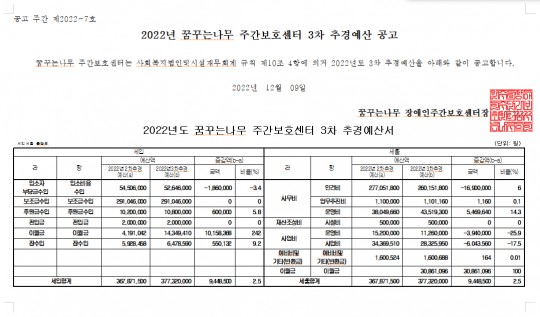 2022년 꿈꾸는나무 주간보호센터 제3차 추경예산 공고