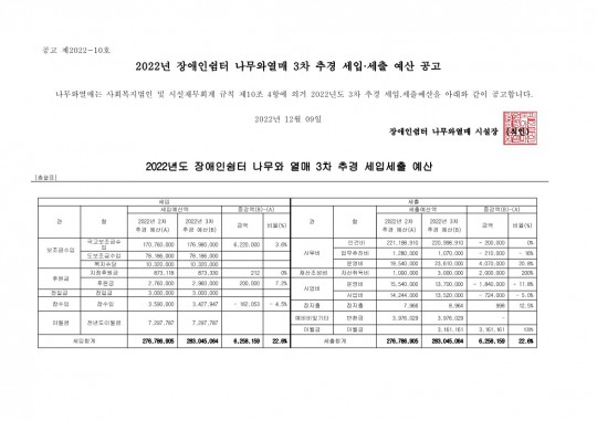 2022년 나무와열매 제3차 추경예산 세입.세출 공고