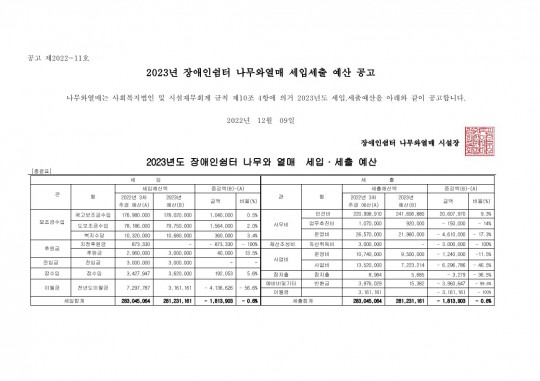 2023년 나무와열매 세입.세출 예산 공고