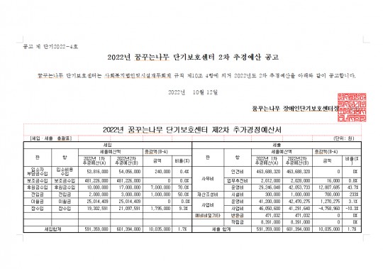 2022년 꿈꾸는나무 단기보호센터 제2차 추경예산 공고
