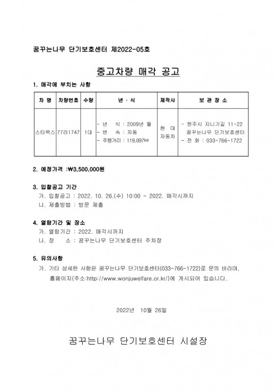 꿈꾸는나무 단기보호센터 차량매각 공고