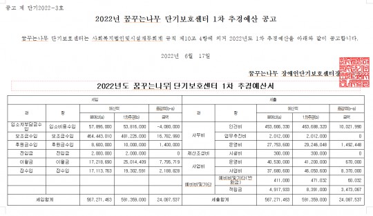 꿈꾸는나무 단기보호센터 2022년 제1차 추경예산 공고