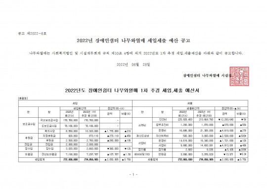 2022년 나무와열매 1차 추경 예산 세입.세출 공고