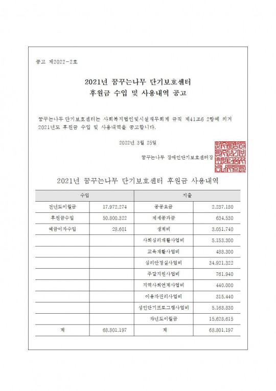 꿈꾸는나무 단기보호센터 2021년 후원금수입 및 사용내역 공고