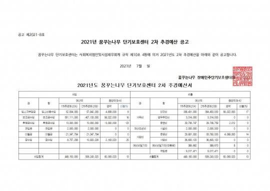 2021년 단기보호센터 2차 추경예산 공고