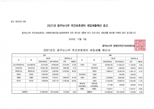 2021년 주간보호센터 세입세출 예산 공고