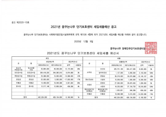 2021년 단기보호센터 세입세출 예산 공고