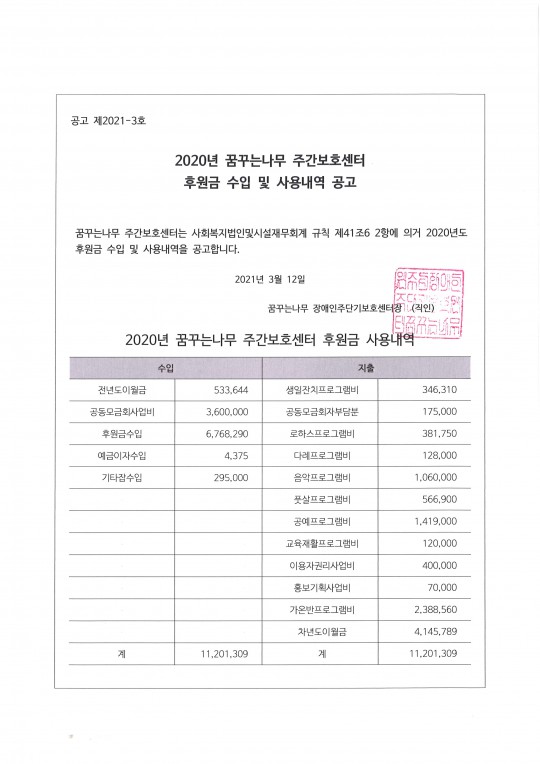 2020년 꿈꾸는나무 주간보호센터 후원금 사용 내역 공고