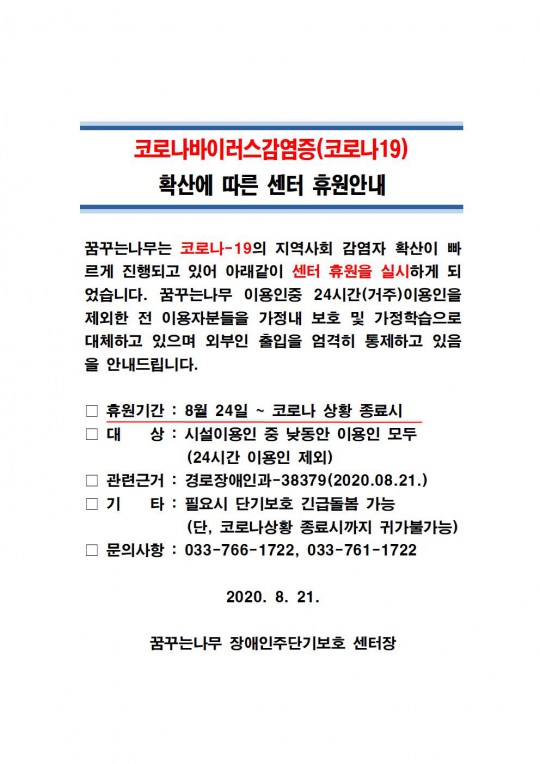 원주지역 코로나19 확진자의 급속한 증가로 지역사회 감염자가 늘어나고 있어 꿈꾸는 나무는 시설 이용인의 감염예방을 위하여 주간보호센터를 코로나19 확산 안정시까지 휴원 ( 단기보호 폐쇄) 합니다. 다소 불편함이 있으시겠지만 감염병 예방을 위해 적극적인 협조를 부탁드립니다.