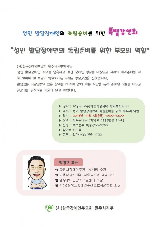 성인발달장애인의 독립준비를 위한 특별강연회가 다음과 같이 진행되오니