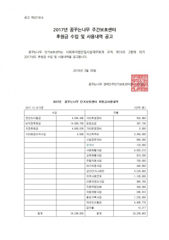 [공고]2017년 꿈꾸는나무 단기보호센터 후원금사용내역 공고