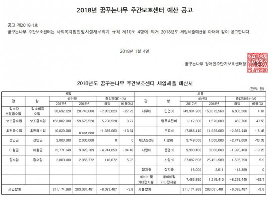 [공고]2018년 꿈꾸는나무 주간보호센터 세입세출 예산 공고