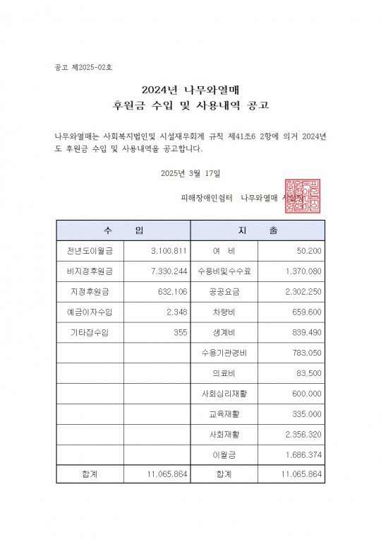 2024년 후원금 수입 및 사용내역 공고(나무와열매)
