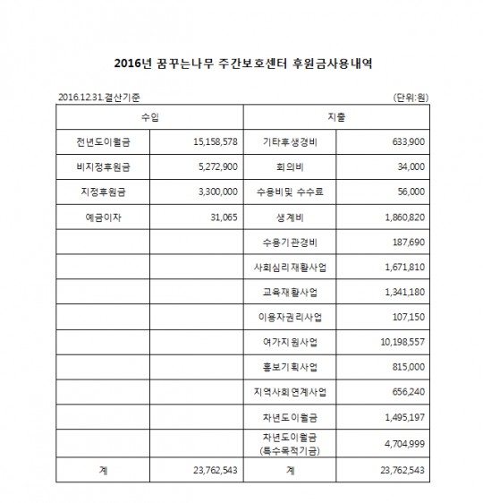 1.내용 : 2016년 후원금수입및사용내역(주간,단기)