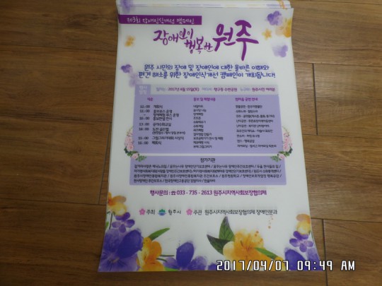 2017년 장애인식개선 캠페인이 2017년 4월 15일(토) 행구동 수변공원에서 개최됩니다.장애인에 대한 올바른 이해와 편견해소를 위한 이번 캠페인 행사에는 다양한 공연도 준비되어 있으니, 많이 참석하셔서 보람된 시간 보내시기 바랍니다.