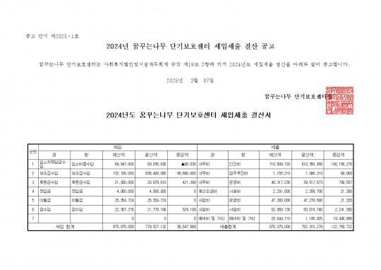 꿈꾸는나무 단기보호센터 2024년 세입세출 결산공고