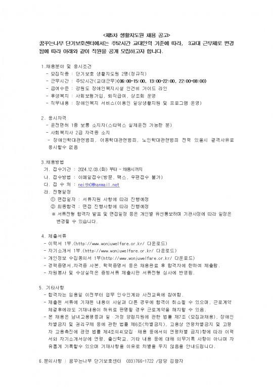 꿈꾸는나무 단기보호센터 2024년 제5차 생활지도원 채용 공고(2명) (2024년 12월 03일)